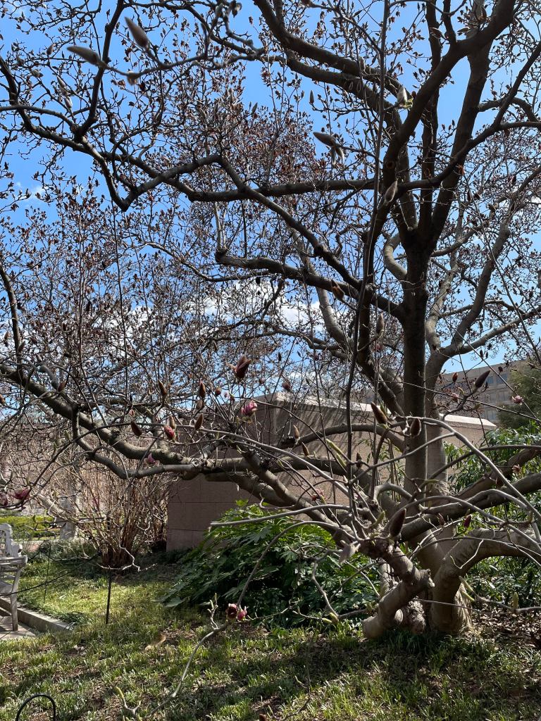 That being said, so too were the magnolias eager for spring. When I walked through the garden on the first day of spring, I was expecting to see the full, luscious magnolia flowers standing at attention on their branches. However, instead of being met with a vibrant cool-toned pink breath of life, I was faced with dark burgundy shriveled up flakes that were once petals. The poor magnolias. How sad it was to see the sign of their excitement for spring. How sad to think that the first glimpse of warmth would condemn them to their death. What a shame to see that their eagerness to bloom was met with a bitter snowstorm. The ghosts of the anticipation and excitement for the future – for spring. The rush to the happy ending. That haste in trying to live in the future.